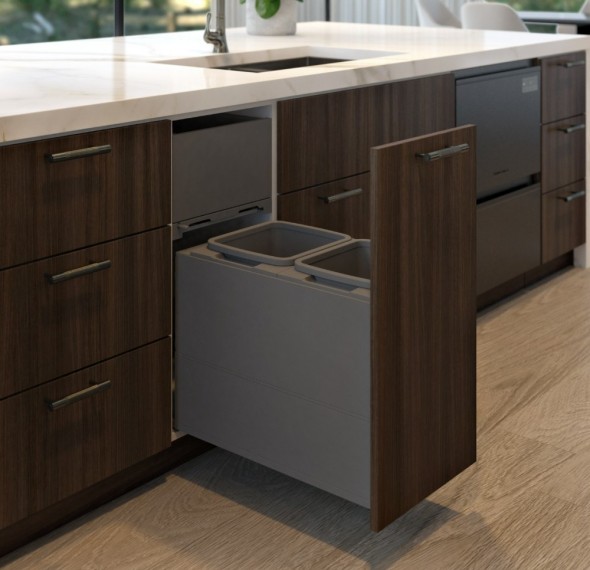 • Push to open — compatible with Blum Servodrive (electronic push to open) and Blum Tip-on-blumotion (manual push to open) systems. Simply bump on the door front and the bin will open.
