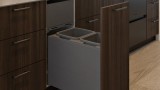 • Active Lid — Hidden from sight at the top of the bin inside the cabinet and drops down to close over the buckets when the bin is closed. The motion of the lid is synchronised with the opening and closing action of the drawer, which lets you keep your hands free to simply drop waste into the bin.