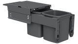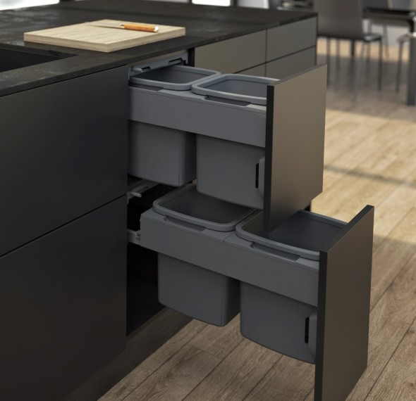 2 x CR350-213D-C Bins stacked in one cabinet to create a 4 bucket waste and recycling solution. The 2 units can fit within a 720mm cabinet height, allowing a 16mm shelf between units. Waste & organics/food scraps can fit in the top 2 bins, recycling can be separated in the lower 2 bins. 52L total storage, in a 350mm wide cabinet.